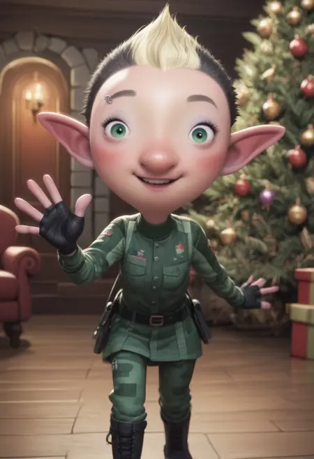 1girl, elf, female elf, petite, black short hair, blond mohawk, pointy ears, elf ears, fingerless gloves, miliary uniform, black boots, piercing on right eyebrow, green eyes, small eyes, big nose, blush