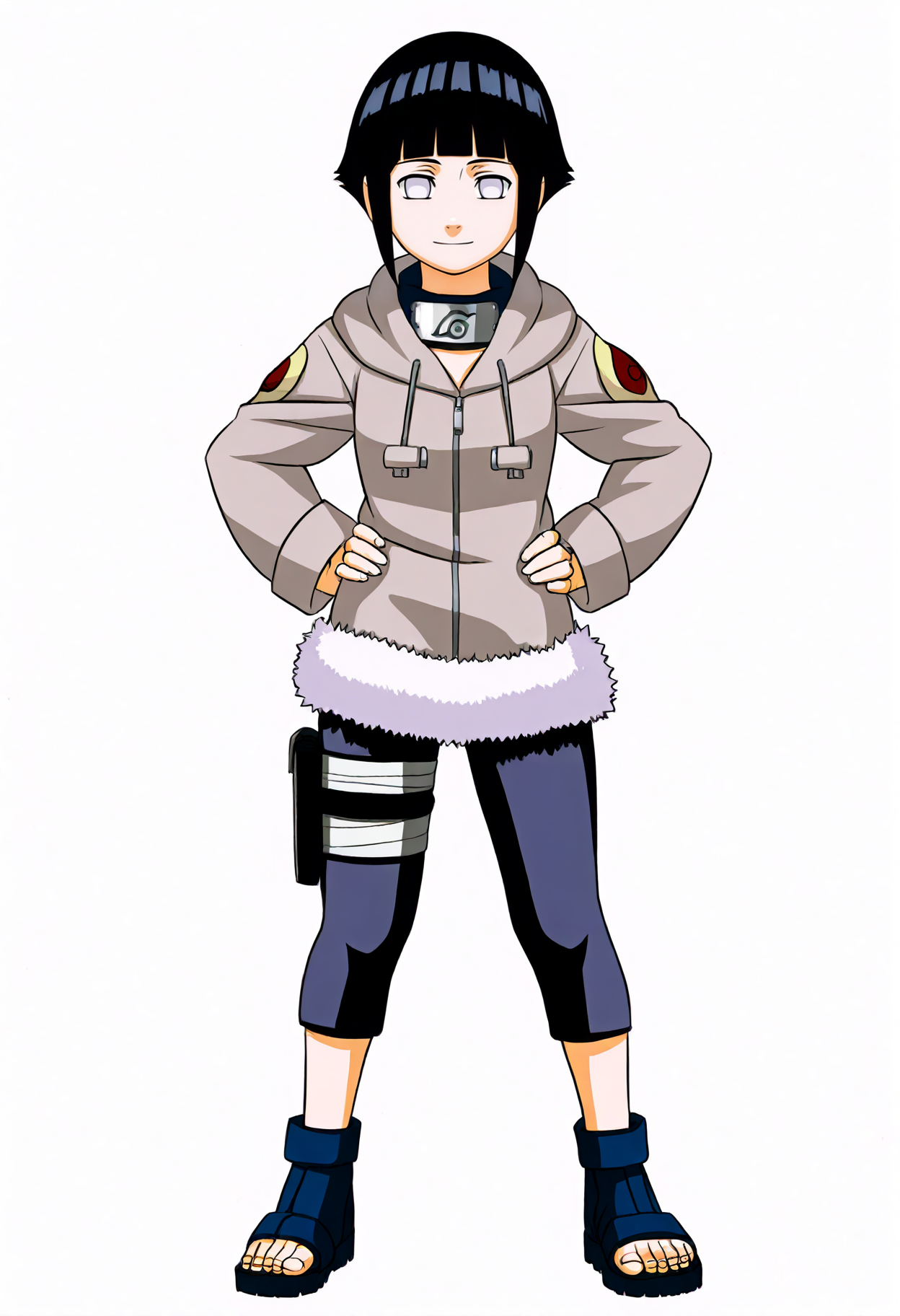 의상 관련 프롬프트: hoodie, hood down, long sleeves, capri pants, fur trim, thigh holster, toeless footwear, bandages, konohagakure symbol