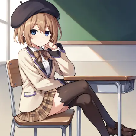 BlancNep, Fol001, Blc_Sch, brown hair, blue eyes, short hair, blanc (neptune series), light brown blazer, brown skirt, plaid skirt, beret, black headwear, dress shirt, white shirt, plaid bow, bowtie, black sleeve cuffs, light brown sleeves, school uniform, black thighhighs, thighhighs, purple trim, brown loafers,