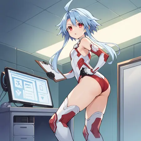 BlancCPU, Wht_Alt, light blue hair, short hair with long locks, red eyes, white heart, armored leotard, white leotard, sleeveless turtleneck leotard, red trim, black finger cots, white gloves, long gloves, armored legwear, white legwear, thigh boots,