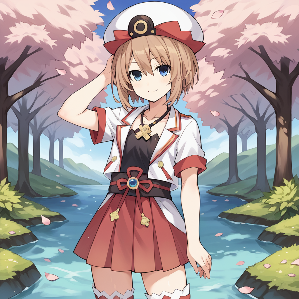 BlancNep, Fol001, Blc_Alt, brown hair, blue eyes, short hair, blanc (neptune series), japanese clothes, halter shirt, red shirt, ribbon trim, red skirt, hakama short skirt, maple leaf print, black sash, red ribbon, cropped jacket, white jacket, red trim, collared jacket, collarbone, sleeves past elbows, wide sleeves, white sleeves, bead bracelet, ribbon-trimmed thighhighs, white thighhighs, white headwear, hat, geta,