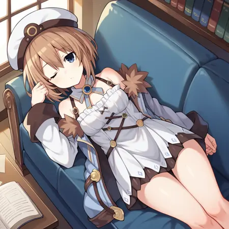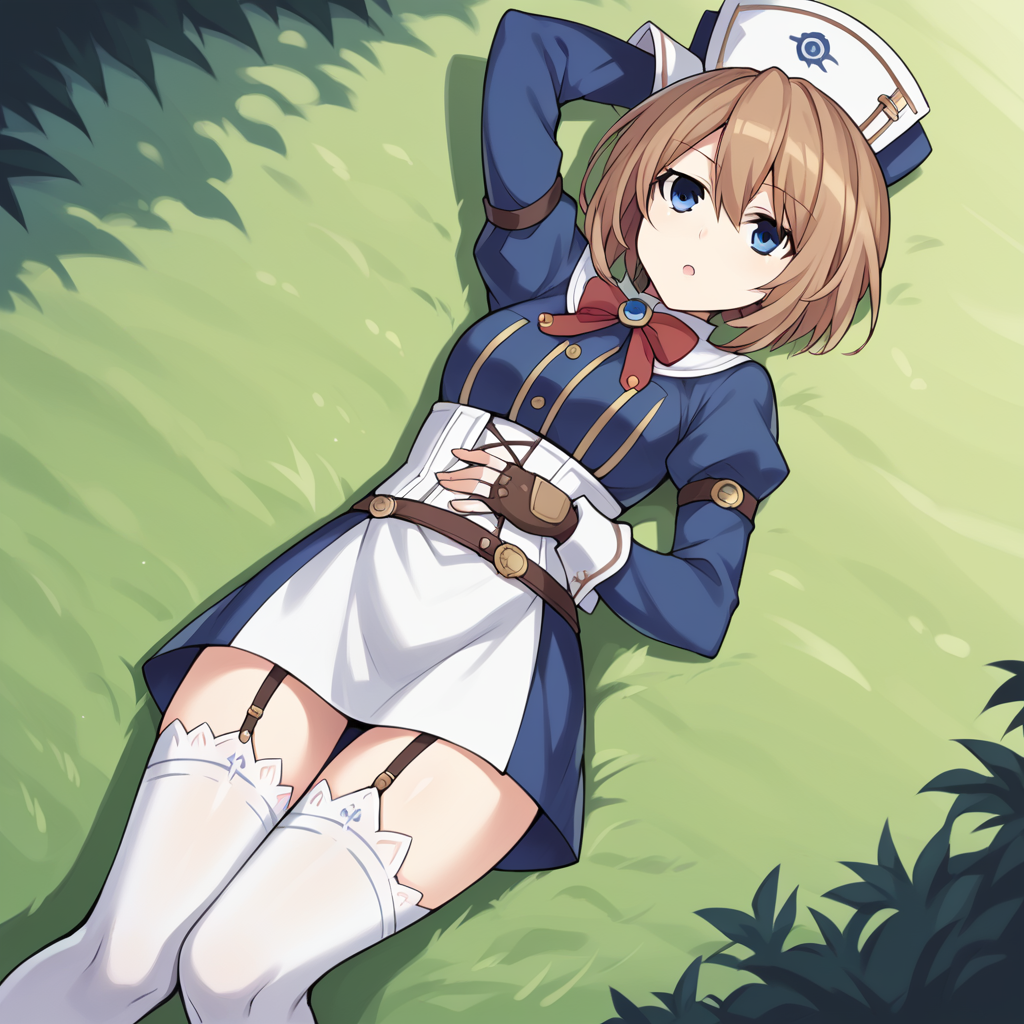 BlancNep, Fol002, Blc_Adv, brown hair, blue eyes, short hair, blanc (neptune series), white headwear, cross-laced corset, white corset, white skirt, skirt, blue blouse, juliet sleeves, blue sleeves, white gorget, red bow ribbon, red bowtie, white sleeve cuffs, brown arm warmers, single garter strap, sleeve belt, white thighhighs, thighhighs, nurse cap, brown boots, high-waist skirt, belt pouch, brown belt,