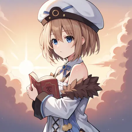 BlancNep, Fol002, Blc_Vrs, brown hair, short hair, blanc (neptune series), blue eyes, sleeveless dress, collared dress, white dress, clothing cutout, hooded coat, short sleeves, blue trim, black sleeves, black coat, hat belt, white hat, multiple belts, blue belt, dark brown belt, fingerless gloves, black gloves, brown feather, brooch, corset, dark blue corset, blue ankle boots,