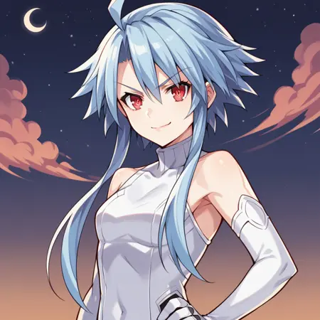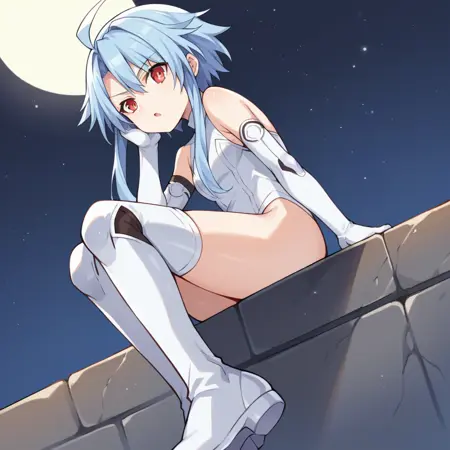 BlancCPU, Wht_Alt, light blue hair, short hair with long locks, red eyes, white heart, armored leotard, white leotard, sleeveless turtleneck leotard, red trim, black finger cots, white gloves, long gloves, armored legwear, white legwear, thigh boots,