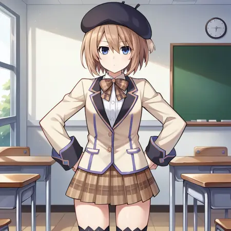 BlancNep, Fol001, Blc_Sch, brown hair, blue eyes, short hair, blanc (neptune series), light brown blazer, brown skirt, plaid skirt, beret, black headwear, dress shirt, white shirt, plaid bow, bowtie, black sleeve cuffs, light brown sleeves, school uniform, black thighhighs, thighhighs, purple trim, brown loafers,