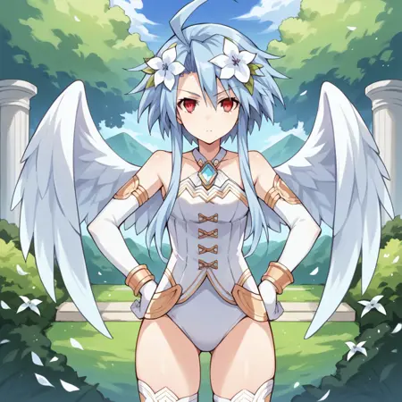 BlancCPU, Wht_Ang, light blue hair, short hair with long locks, red eyes, white heart, white vest, halterneck, blue gem, white panties, angel, gold trim, bare shoulders, mechanical gloves, white gloves, gold wrist cuffs, white flower, halo, feathered wings, angel wings, hair flower, detached sleeves, white sleeves, white thighhighs, thighhighs, no skirt,