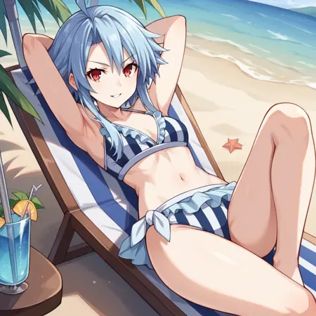 BlancCPU, Wht_Swm, light blue hair, short hair with long locks, red eyes, ahoge, white heart, frilled bikini, cleavage, flat chest, vertical-striped, striped bikini, side-tie skirt, white skirt, frilled skirt, bikini skirt, ring necklace,
