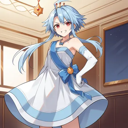 BlancCPU, Wht_Whd, light blue hair, short hair with long locks, red eyes, ahoge, white heart, strapless dress, silver pendant choker, red jewel, elbow gloves, white gloves, blue strap, blue bow, big bow, shoulder strap, mini crown, blue shoes,
