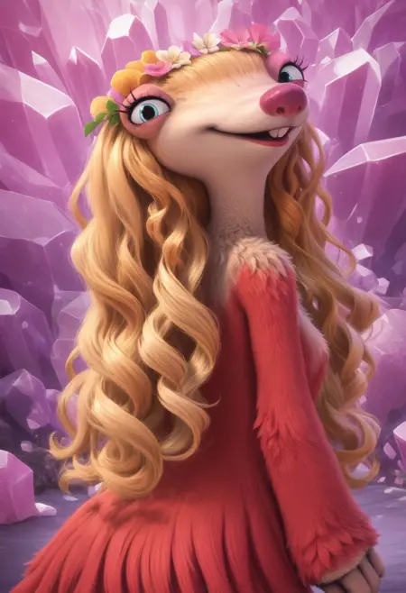 furry, anthro, female sloth, ground sloth, blonde hair, long wavy hair, red fur, red fur dress, blonde fur on upper body, two-toned fur, pink nose, buckteeth, hair ornament, white claws,