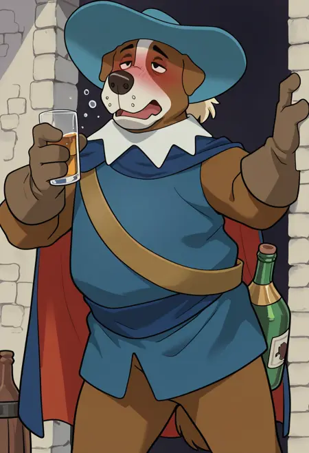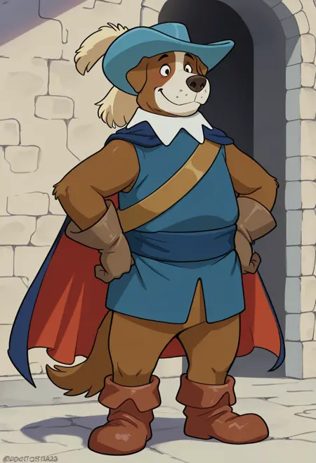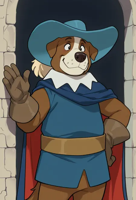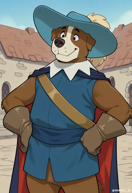 Illustrious: best quality, amazing quality, very aesthetic, absurdres, newest, athos, dogtanian_and_the_three_muskehounds, hat, 1boy, solo, furry male, black eyes, gloves, cape, hat, ...your tags...