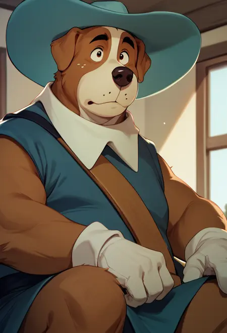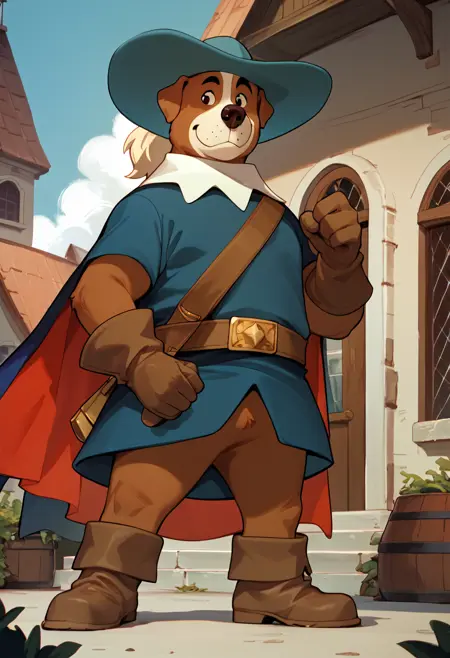Illustrious: best quality, amazing quality, very aesthetic, absurdres, newest, athos, dogtanian_and_the_three_muskehounds, hat, 1boy, solo, furry male, black eyes, gloves, cape, hat, ...your tags...