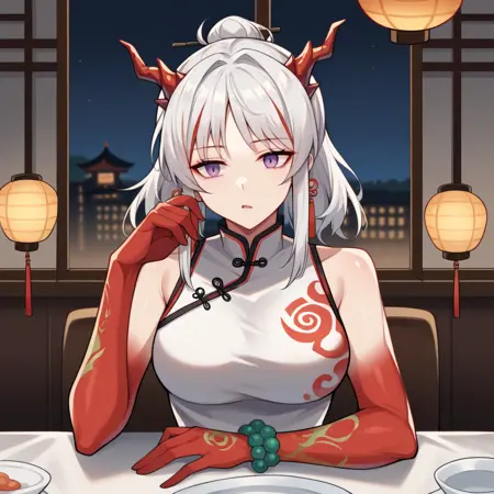 Ni_CN,裙摆帘,中式连衣裙,白色连衣裙,无袖连衣裙,珠串手链,红色手套,肘部手套,指甲,