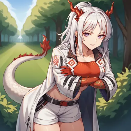 NianArk, 年 (明日方舟),紫色眼睛,白发,红发,条纹发,角,龙尾,高马尾,