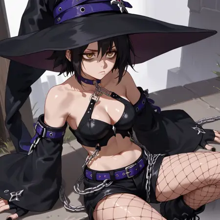 witch hat, large hat, 1girl, solo, black hair, short hair, bare shoulders, chain, midriff, detached sleeves, breasts,medium breasts, fishnets, choker,collar, cleavage, brown eyes, shorts, navel, belt, pantyhose, boots, gloves, black shorts, fishnet pantyhose, fingerless gloves, nail polish, bags under eyes,