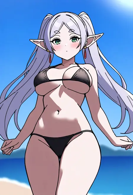 Basic prompts : 1girl, frieren, green eyes, grey hair, twintails, pointy ears, eyebrows, earrings