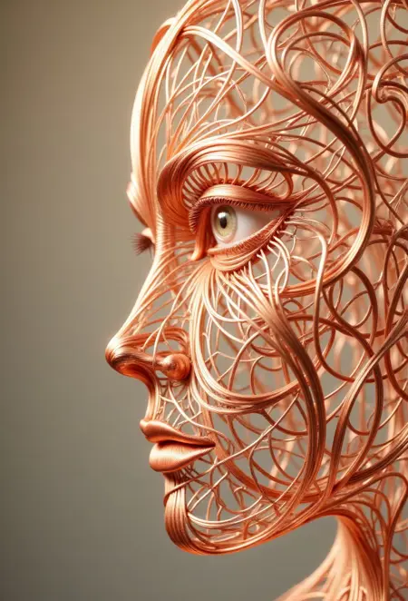 Prompt: "A style of art copper art coppern a A Crafted from shimmering copper wire, the lotus flower unfurls its petals, capturing the essence of purity and rebirth. The surrounding environment is a tranquil pond, where the flower floats gracefully, reflecting the golden hues of a setting sun."