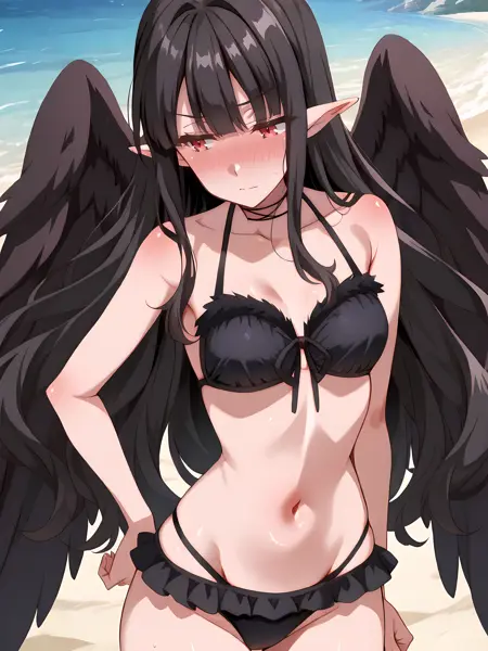evereesedress, bare shoulders, collarbone,feathered wings, black wings, sleeveless, black dress, black ribbon, halterneck,criss-cross halter, bandages,jewelry, necklace,