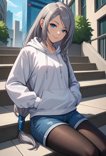 トリガー+外見: jlwrck, 長い髪, 灰色の髪, 片側の編み込み, 横編み, 青い目
