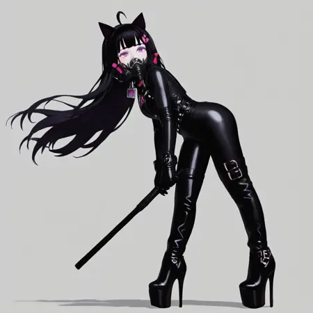 licoricegt, black hair, solo, 1girl, ahoge, cat ears, long hair, purple eyelashes, mole, butterfly hairclip, white skin, colored skin