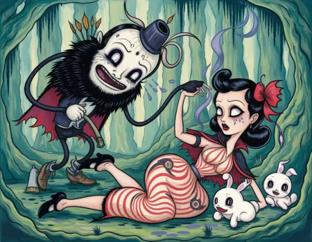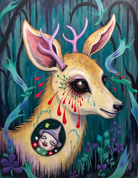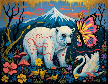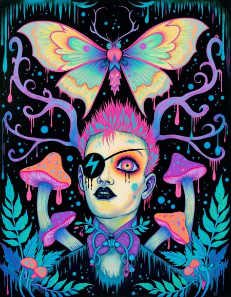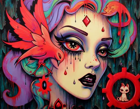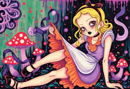 ポップ・サレアリズムは、シュールレアリズムの神秘的で夢のような要素と、ブラックライト・ローブロウアートの大胆で幻覚的な美学を融合させたアートを生成します。このモデルは、ネオンカラーとサイケデリックなトーンを纏った流動的で異世界的な人物像と抽象的な環境を生み出し、鮮やかで非現実的な雰囲気を醸し出します。その際立つ色彩とシュールな構成は、観客を幻覚的で象徴的な世界へと没入させます。生成されるアートは、カミーユ・ローズ・ガルシアの魅力的で視覚的に圧倒的な作品のように、ファンタジックで没入感に満ちています。