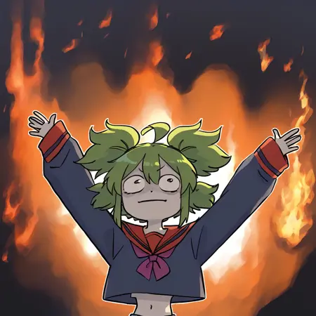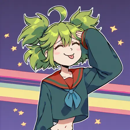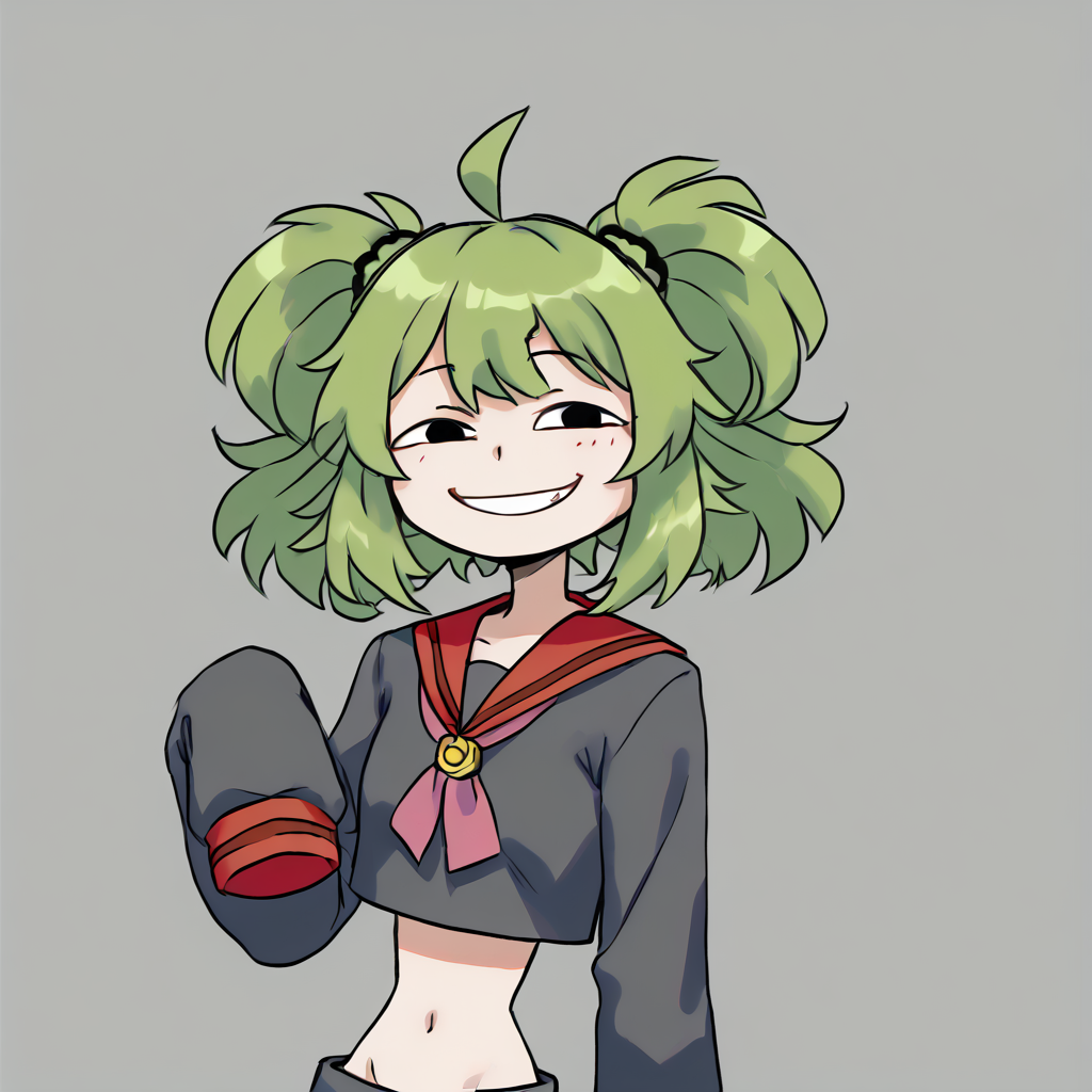 uksrtshame, 1girl, solo, green hair, twintails, sleeves past wrists, school uniform, colored sclera, ahoge, midriff