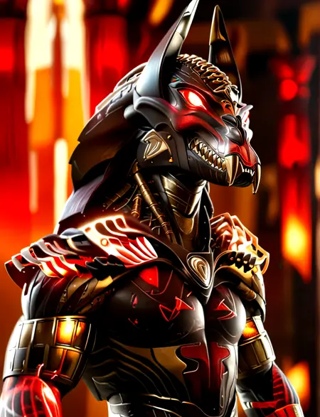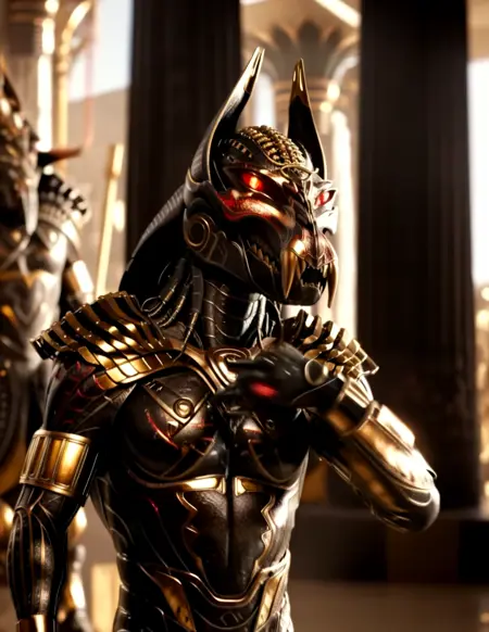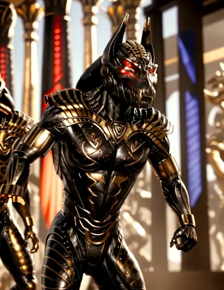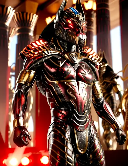 네 번째 그룹은 최종적으로 사용되지 않은 캐릭터의 대안적이고 잠재적인 외모를 위한 것입니다: Set, Gods of Egypt, 근육질, 로봇, 메카, 빛나는 붉은 눈, 대안적 디자인, 단순한 배경, 실내, 치마, 뒤통수 허리 망토, 샤인디트.