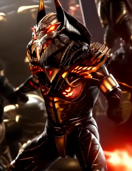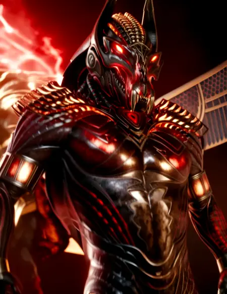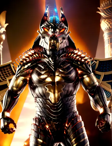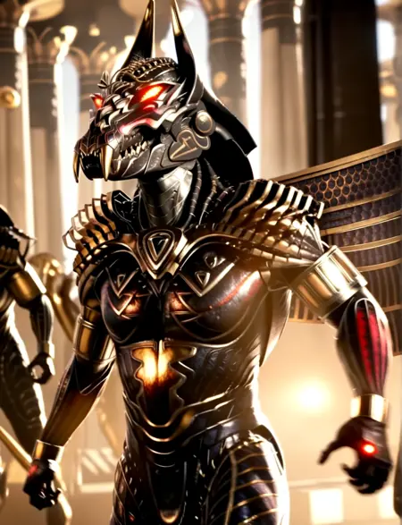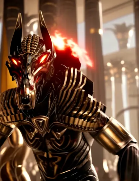 세 번째 그룹은 영화 말미의 최종 싸움 장면에서 유래했습니다: Set, Gods of Egypt, 근육질, 로봇, 메카, 매끄러운 금속 몸체, 빛나는 붉은 눈, 강화된 신체, 날개, 야간. 물론 싸움 장면에서 날개가 제거된 부분에는 날개 표현을 생략할 수 있으며, 세트가 날아다니는 장면에서는 '날아다니는'이라는 단어도 필요에 따라 제외할 수 있습니다.