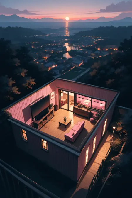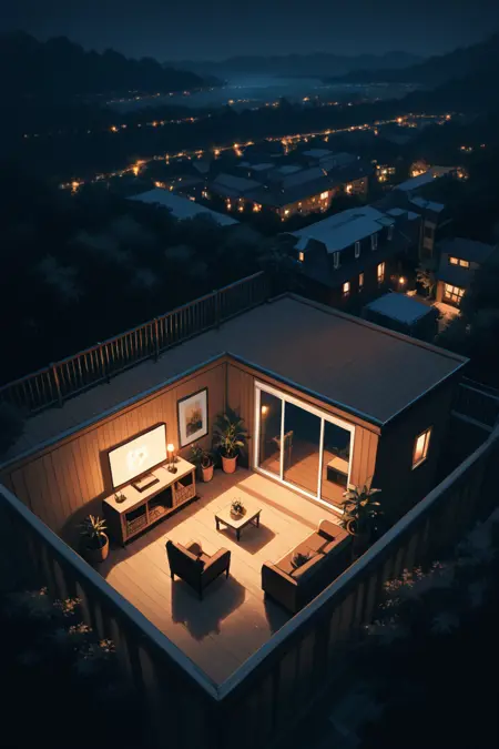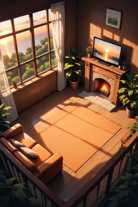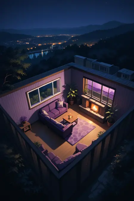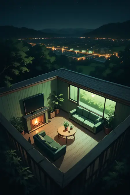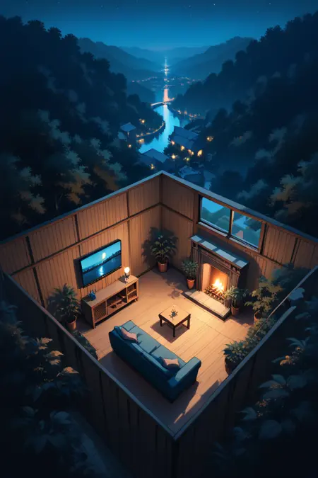 Cabin in the woods = forest cabin focus, CandiFR, from above, negative space,