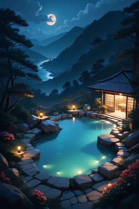温泉 = 戸外温泉に焦点、Candihotspring、上方から、負の空間、