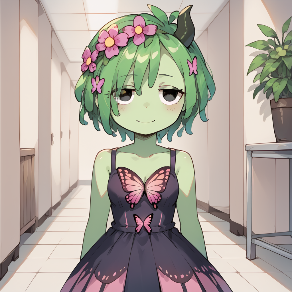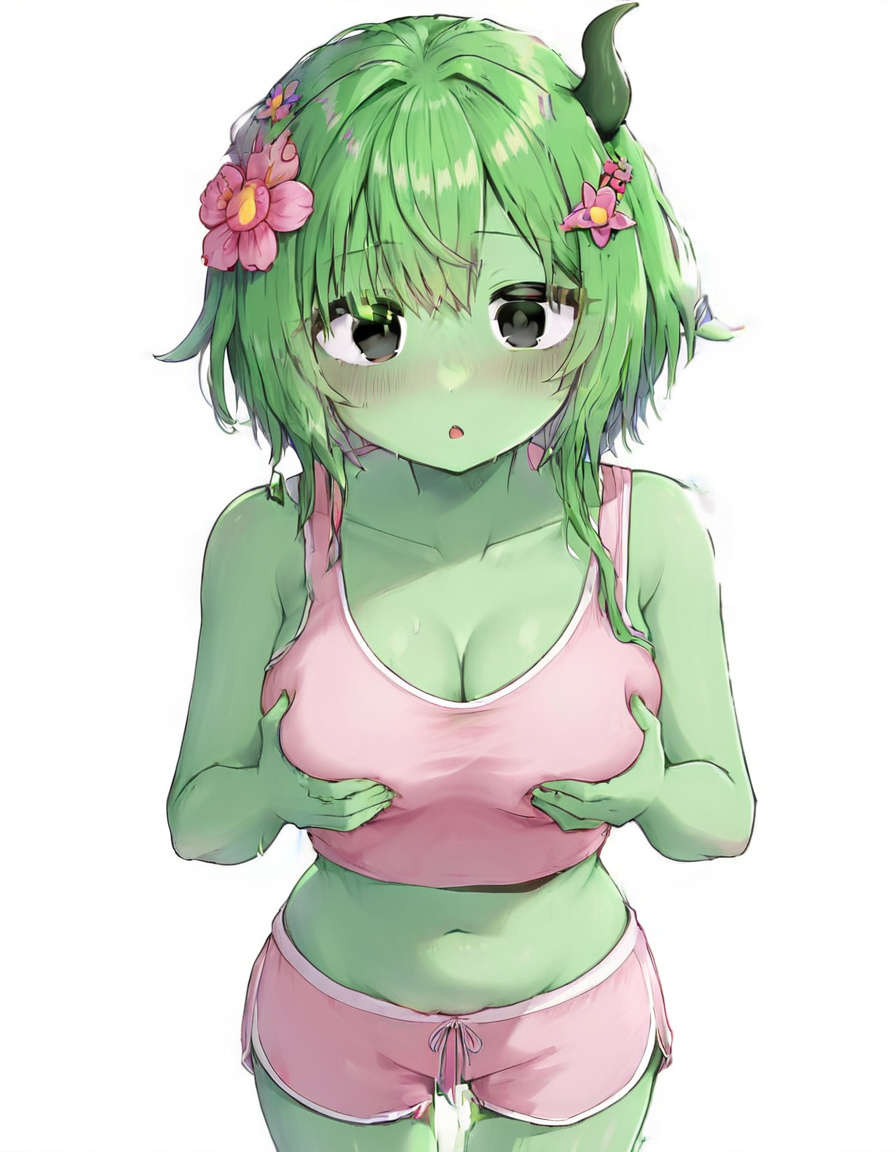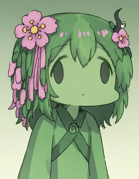 vineriasprunki, 1girl, solo, green skin, colored skin, flower, hair flower, hair ornament, pink flower, green hair, plant girl, black eyes