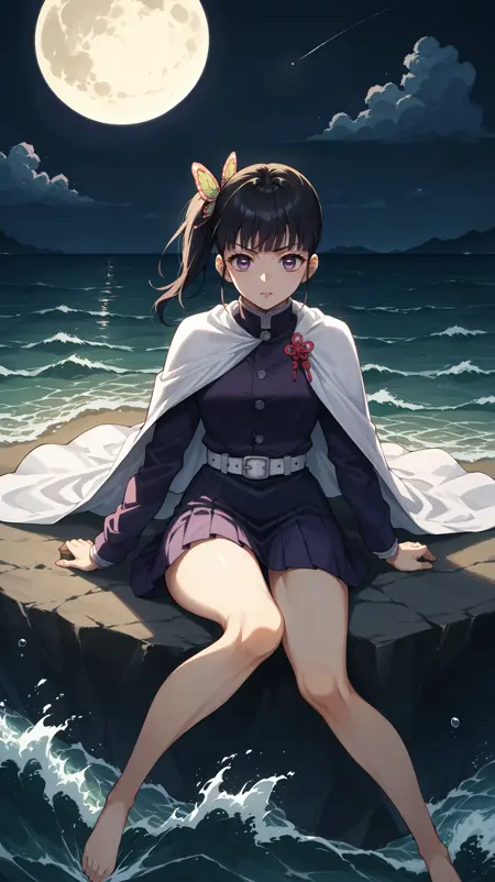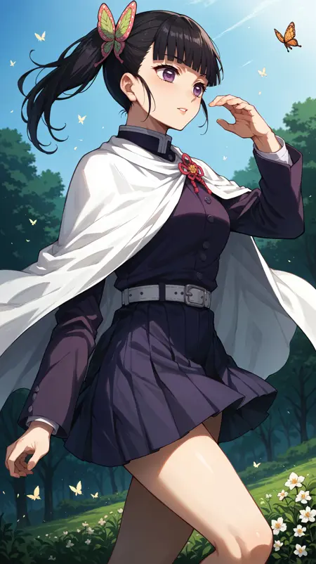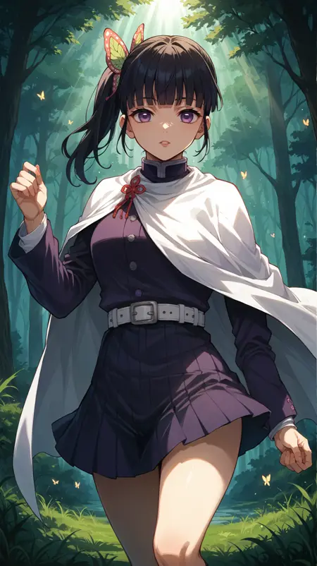 黑发,侧马尾,齐刘海,蝴蝶发饰,发饰,紫色眼睛,紫色夹克,长袖,紫色裙子,白色腰带,白色斗篷