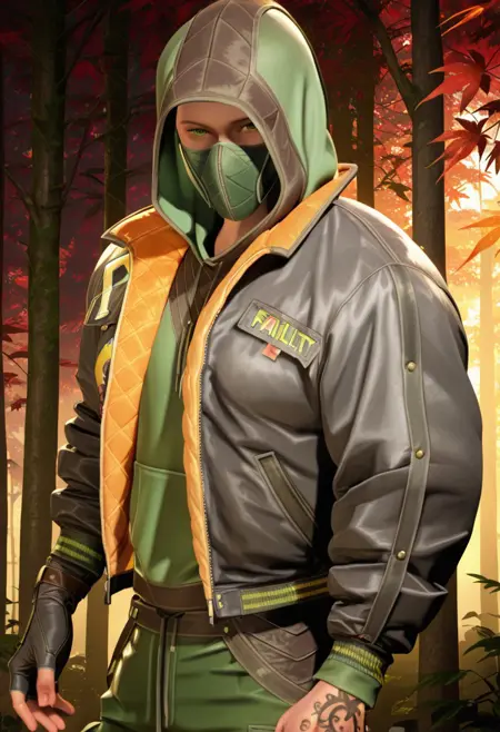 _reptile_casual_1, 绿色眼睛, 绿色兜帽带棕色帽檐, 深灰色飞行员夹克带橙色绗缝内衬, 前面有“致命一击”徽章, 背面有爬虫类徽章, 橙绿条纹袖口, 绿色连帽衫, 手部纹身, 单只白色无指手套, 绿色工装裤, 腰带上悬挂深灰色布料, 橙绿配色运动鞋, 橙色鞋底, 白色袜子, 随意的绿色面罩,