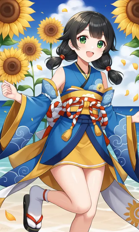 Hiyoribo, black hair, low twintails, bang, green eyes, japanese clothes, ocean blue kimono, detached sleeves, ocean blue sleeves, bare shoulder, tabi socks, hair ornaments, rope, bow, sash, obi