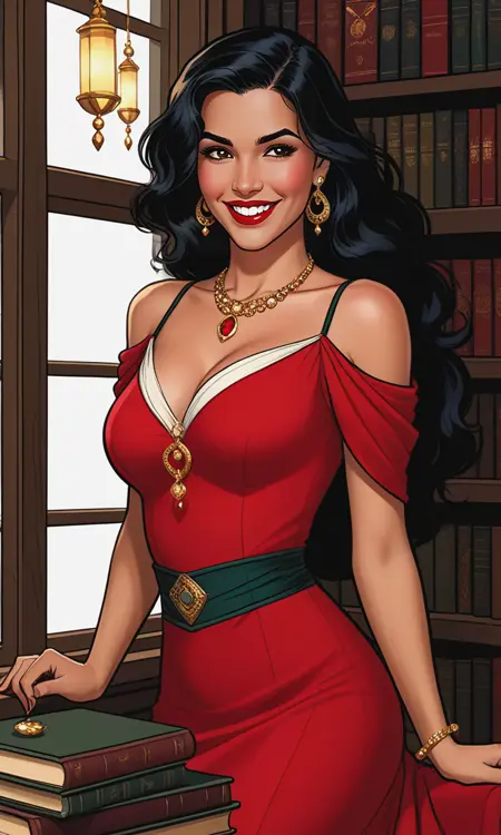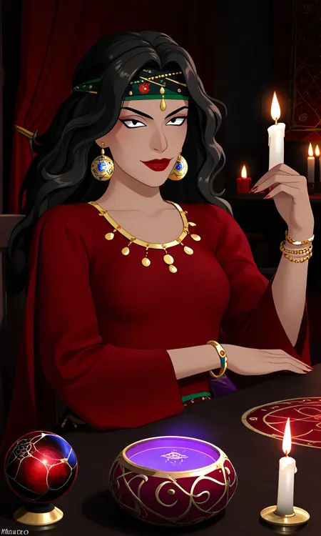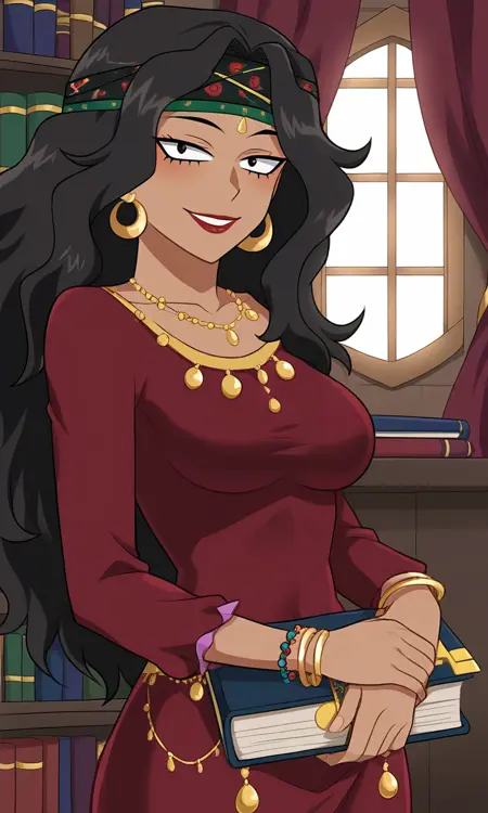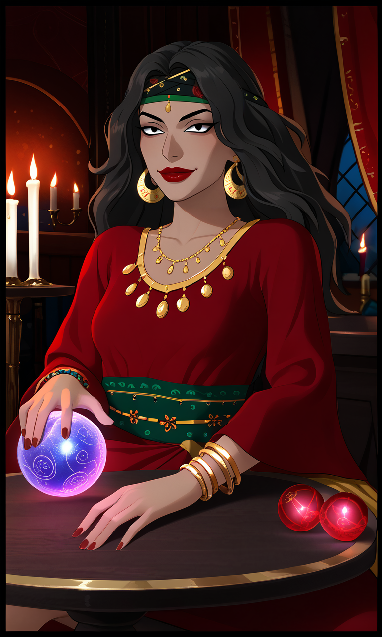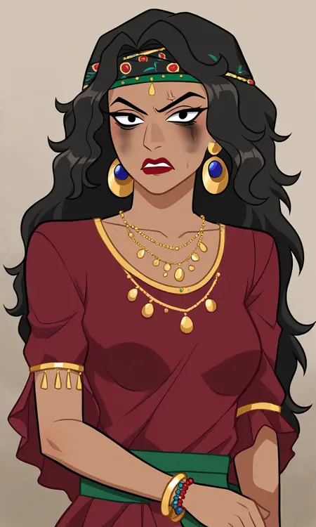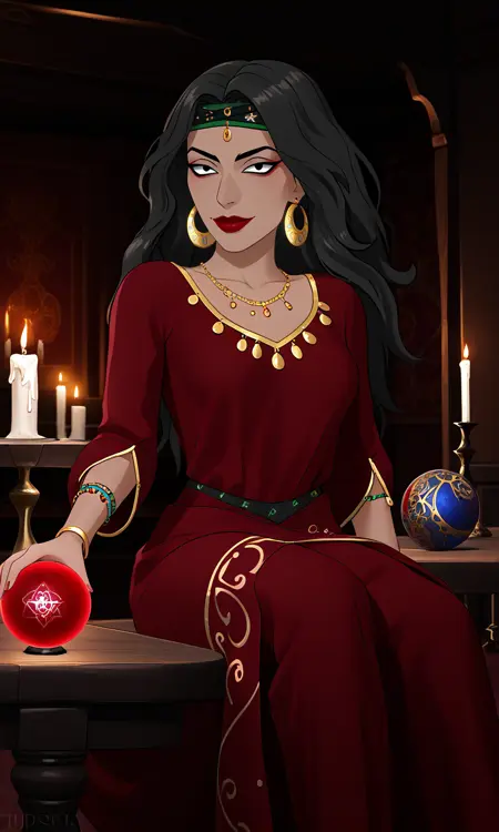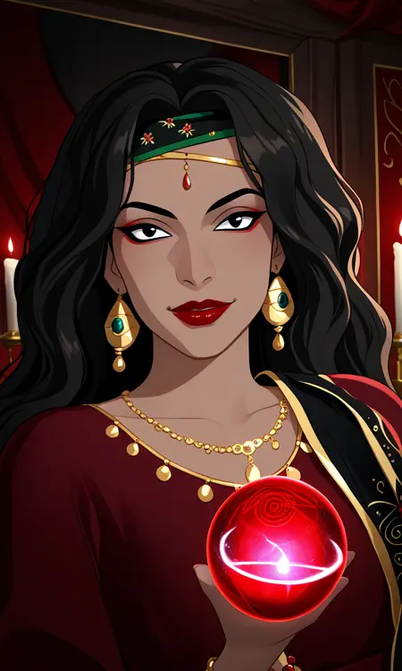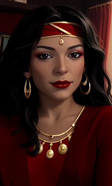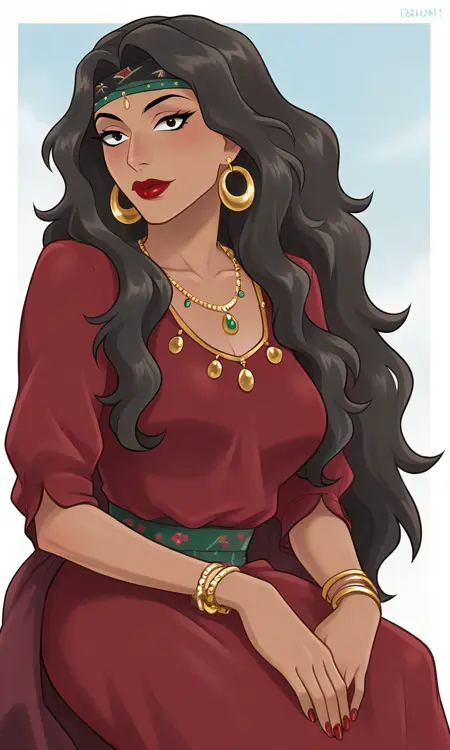 1woman,black hair,long hair,gypsy,tanned skin,black eyes,gypsy dress,jewelry,red lips