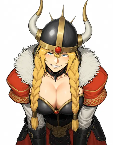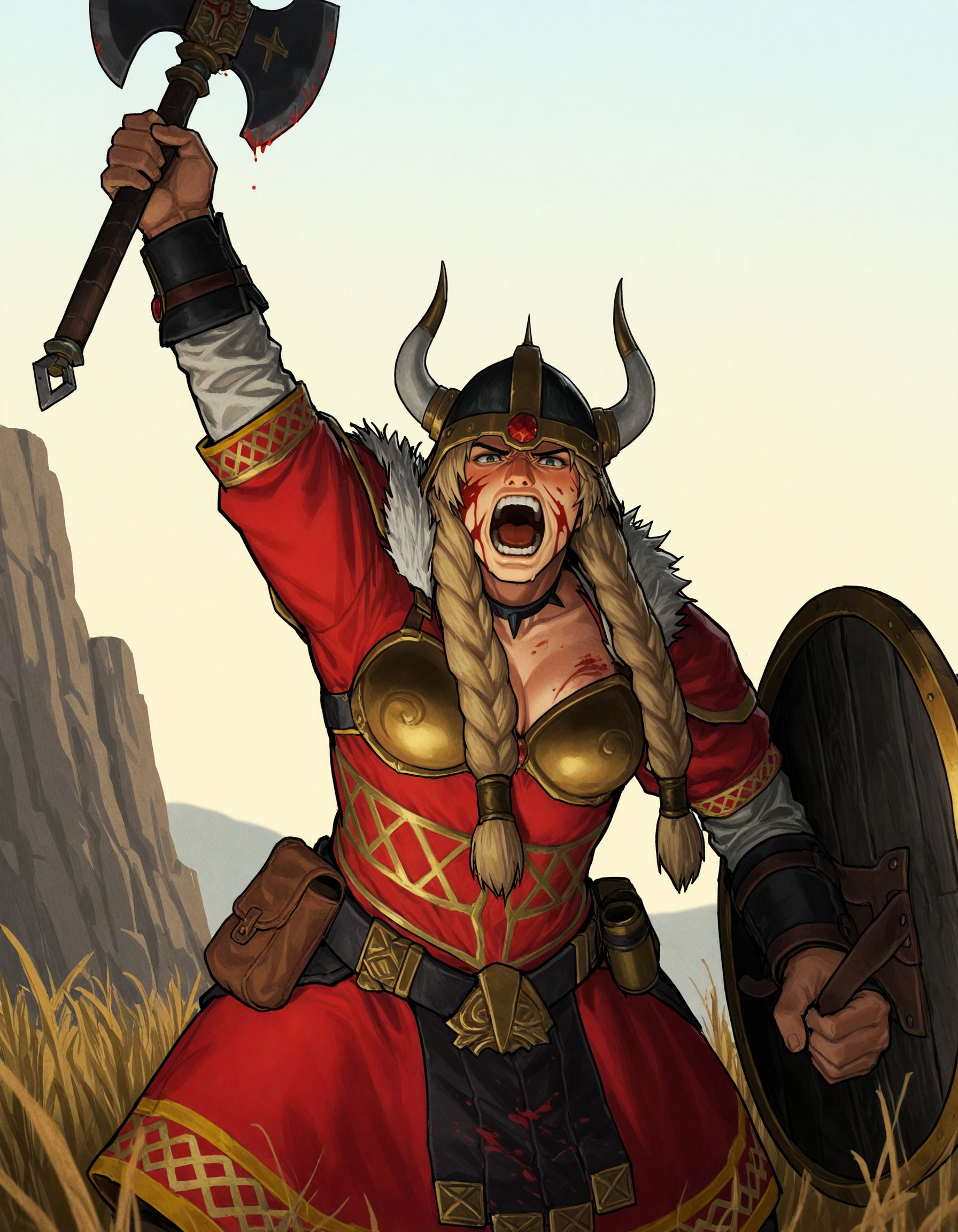 HelgarLongplaits, twin braids, horned helmet, armor, axe, shield,
