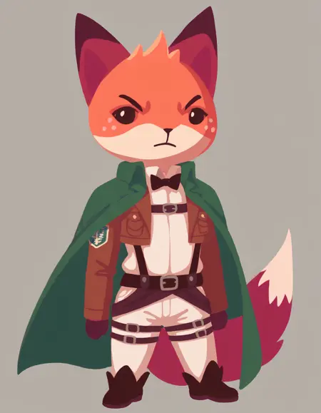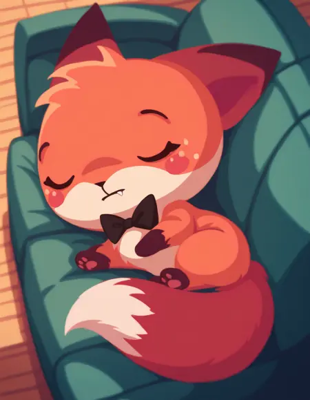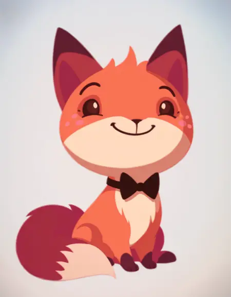 プロンプト: Foxy_vkstickers, solo, red fox, two tone fur, fox tail, black eyes, black sclera, black bow on the neck.