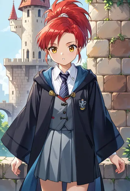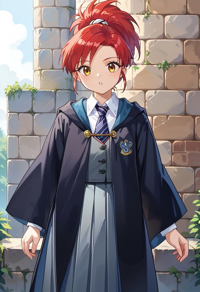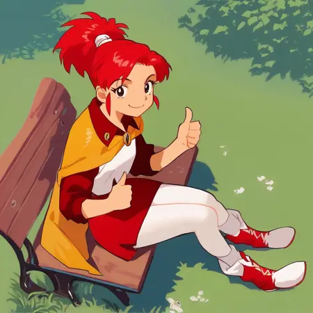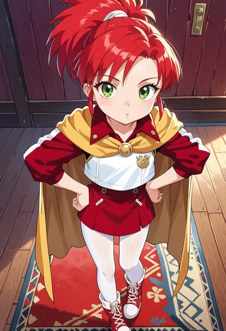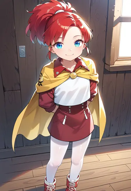 プロンプト: Elie_Lunar, 赤髪, ポニーテール, 横髪, ケープ, 黄色いケープ, ジャケット, リブ付きジャケット, ラグラン袖, ドレス, 赤いドレス, パンティーホーゼ, 白いパンティーホーゼ, ブーツ, 赤いブーツ,