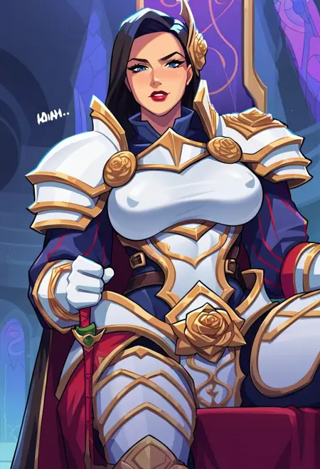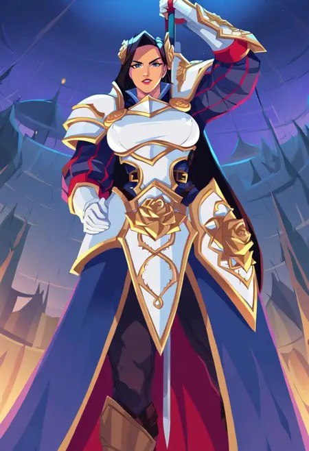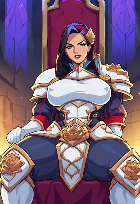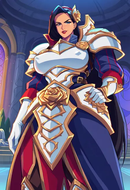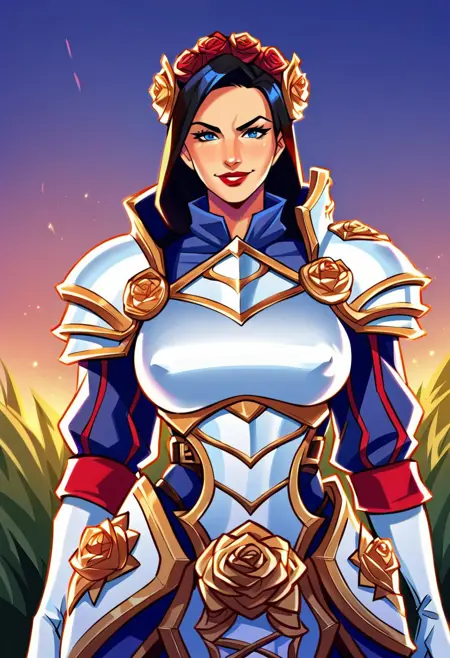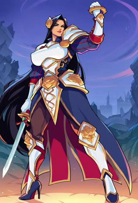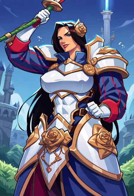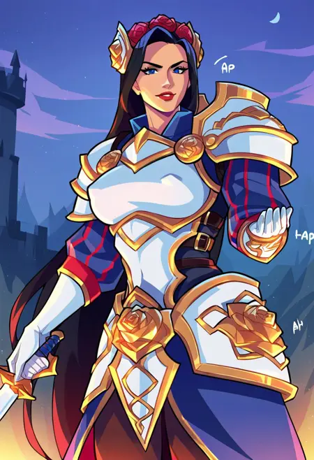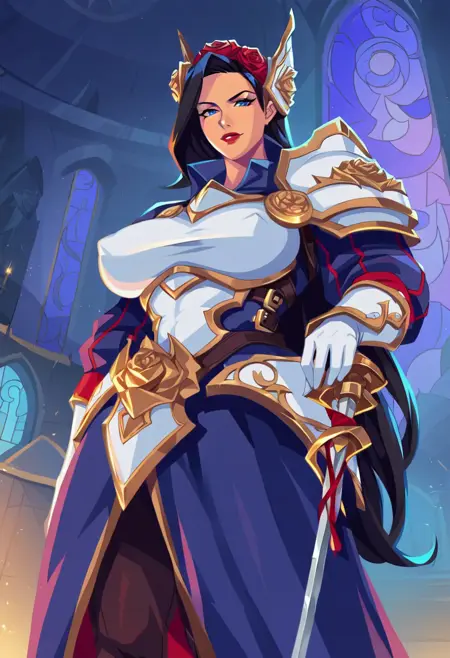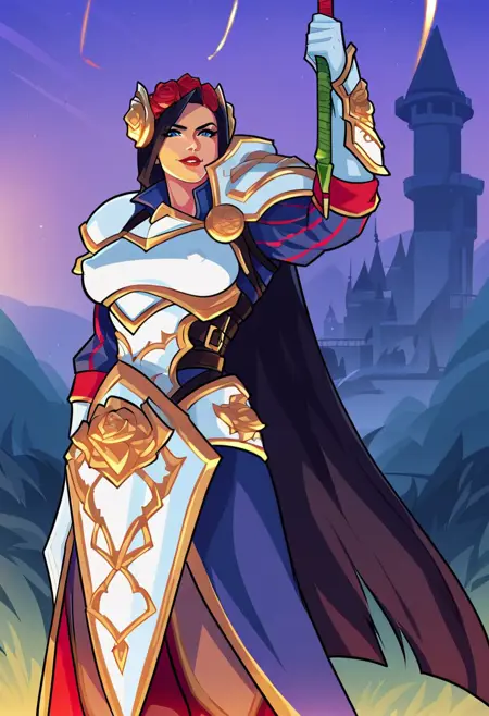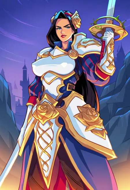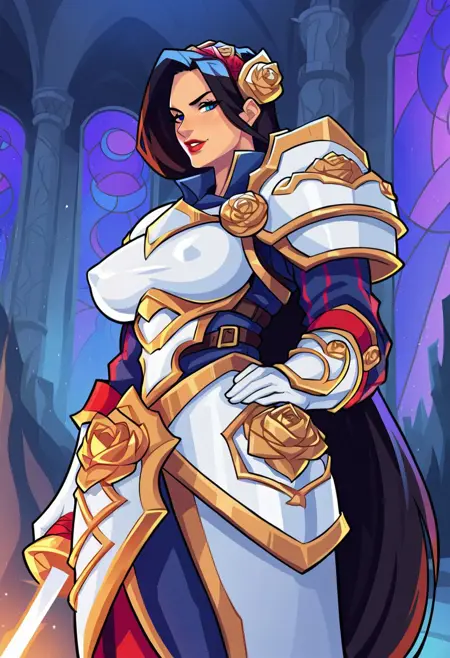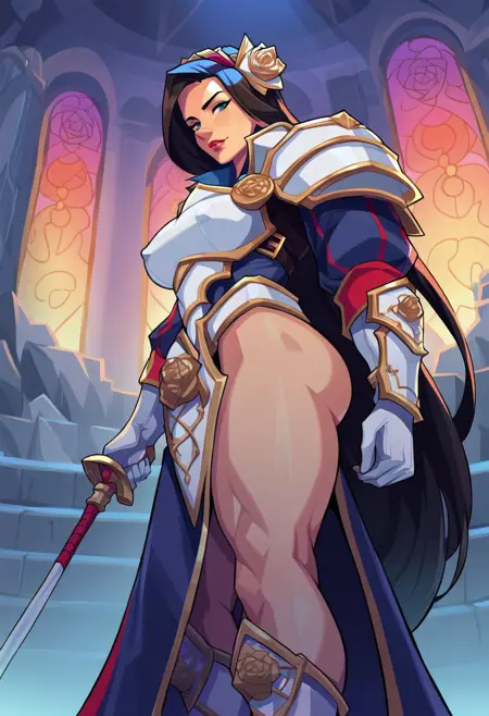 LadyofThorns,1girl,solo,非常に長い髪,黒髪,青い目,鎧,フルアーマー,白い鎧,ナイトアーマー,肩甲板,胸当て,パルドロン,手袋,腕甲,脚甲,ブーツ,ハイヒール,骨盤カーテン,剣,唇,赤い口紅,花,薔薇,花の装飾,髪の花,髪の装飾,
