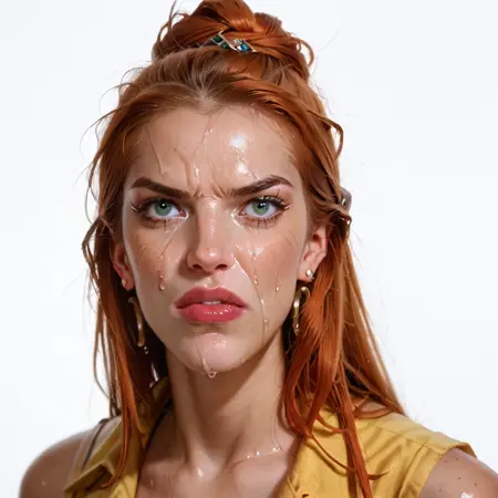 この射精は、湿ったデザインと光沢、顔に少し滴る様子を表現した中程度の量を表しています。