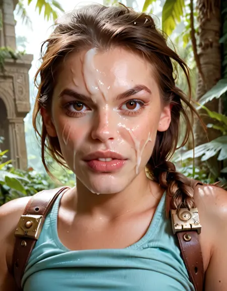 ポジティブ:score_9、score_8_up、score_7_up、FCLHGE、1girl、solo、茶色の髪、茶色の目、一本の編み込み、テル系のタンクトップを上げる、小さな胸、ノースリーブ、肩紐、茶色のショートパンツ、太ももハーネス、胸が目立つ、裸の平らな胸、小さな胸、上半身、Facial cum wet、屋外、古い神社の背景、ジャングルエリア、完璧な目のディテール