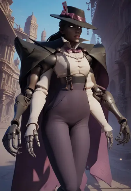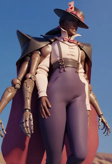 four arms, mechanical arms, dark skin, cape, bow, shirt, high-waist pants, bowtie, pants, playing card in hat