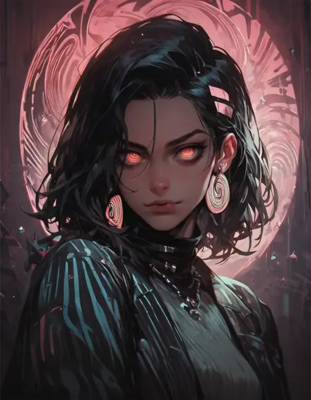 modernxr, solo, 1girl, looking at viewer, jewelry, earrings, black hair, upper body, long hair, simple background, closed mouth, bangs, jacket, short hair, piercing, lips, necklace, shirt, red eyes, teeth, breasts, ear piercing, smile, black jacket, tattoo, mask