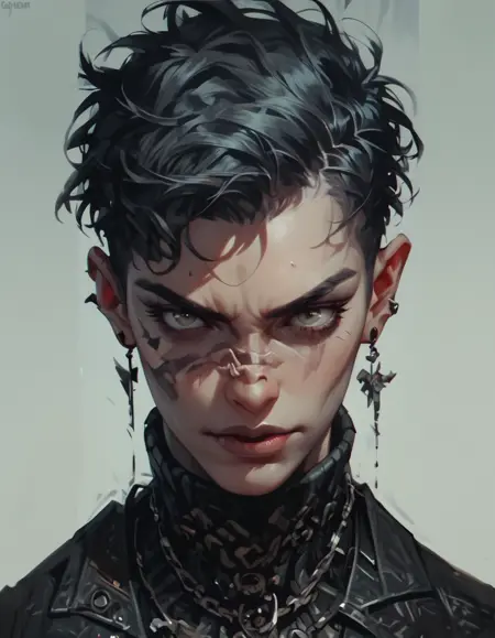 modernxl, solo, looking at viewer, 1girl, jewelry, earrings, black hair, long hair, upper body, simple background, bangs, piercing, teeth, short hair, lips, closed mouth, necklace, jacket, ear piercing, portrait, smile, red eyes, shirt, breasts, tattoo, mask