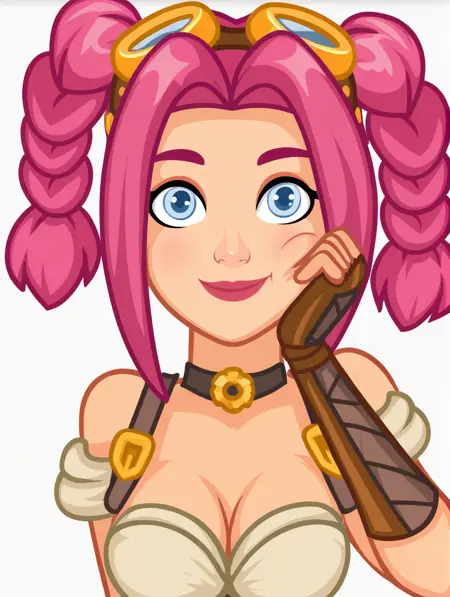 我猜如果想更贴纸风格化,可以调高权重;如果想让生成器更自由地画出更清晰但不一定精准的衣物,可以调低权重。模型偏向生成上半身肖像,因为大多数贴纸都是这样。如果想让胸部更突出,可加入“breasts”和低角度视角。某些角度下使用“cleavage”可能会让胸部显得过大,因此若追求SFW内容,请勿使用此提示词。你不必使用PONY专属提示词(例如score_9、score_8_up、score_7_up),不包含它们反而可能让她更贴近真实的贴纸风格(至少在AutismMix/Pony Diffusion中是如此)。