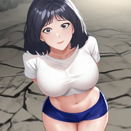 ((섹시한 짧은 소매 흰 상의, 짧은 네이비 블루 반바지, )) + 흰 신발,