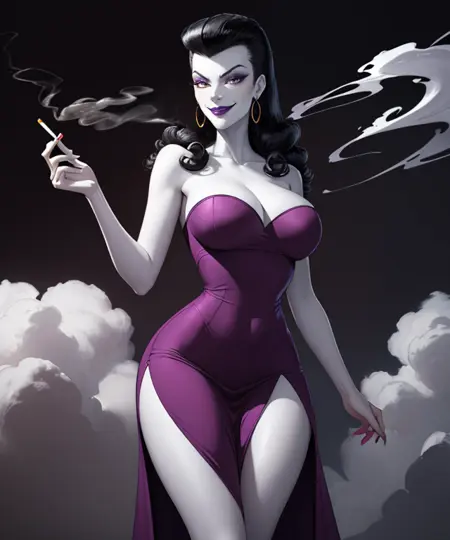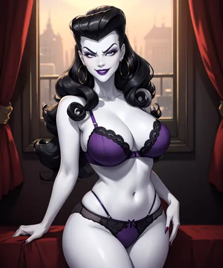 외모 힌트: 검은색_머리, 긴_머리, 퐁파두르, 곱슬_머리, 창백한_피부, 메이크업, 보라색_립스틱, 아이섀도우, 귀걸이, 보석, 큰_가슴, 풀바디, 악랄한_미소,