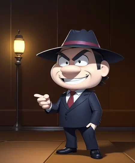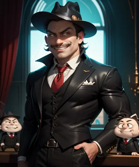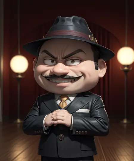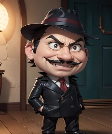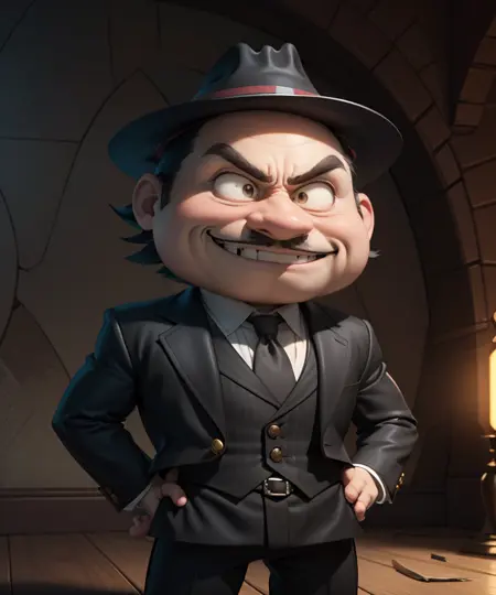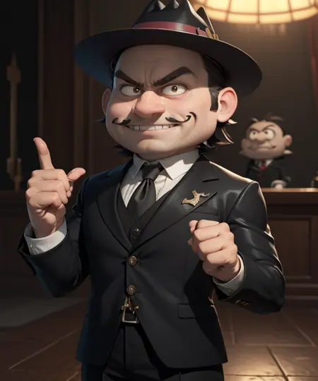 외모 힌트: 1boy, male_focus, short_male, chibi, pale_skin, evil_grin, black hair, big_nose, tiny_mustache, pointy_mustache, stocky, evil_smile,