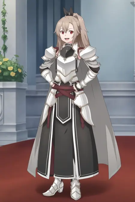 - Armor | cape, sword, energy sword, armored dress, breastplate, gauntlets, shoulder armor, eyepatch | floating hair, arms up, holding sword