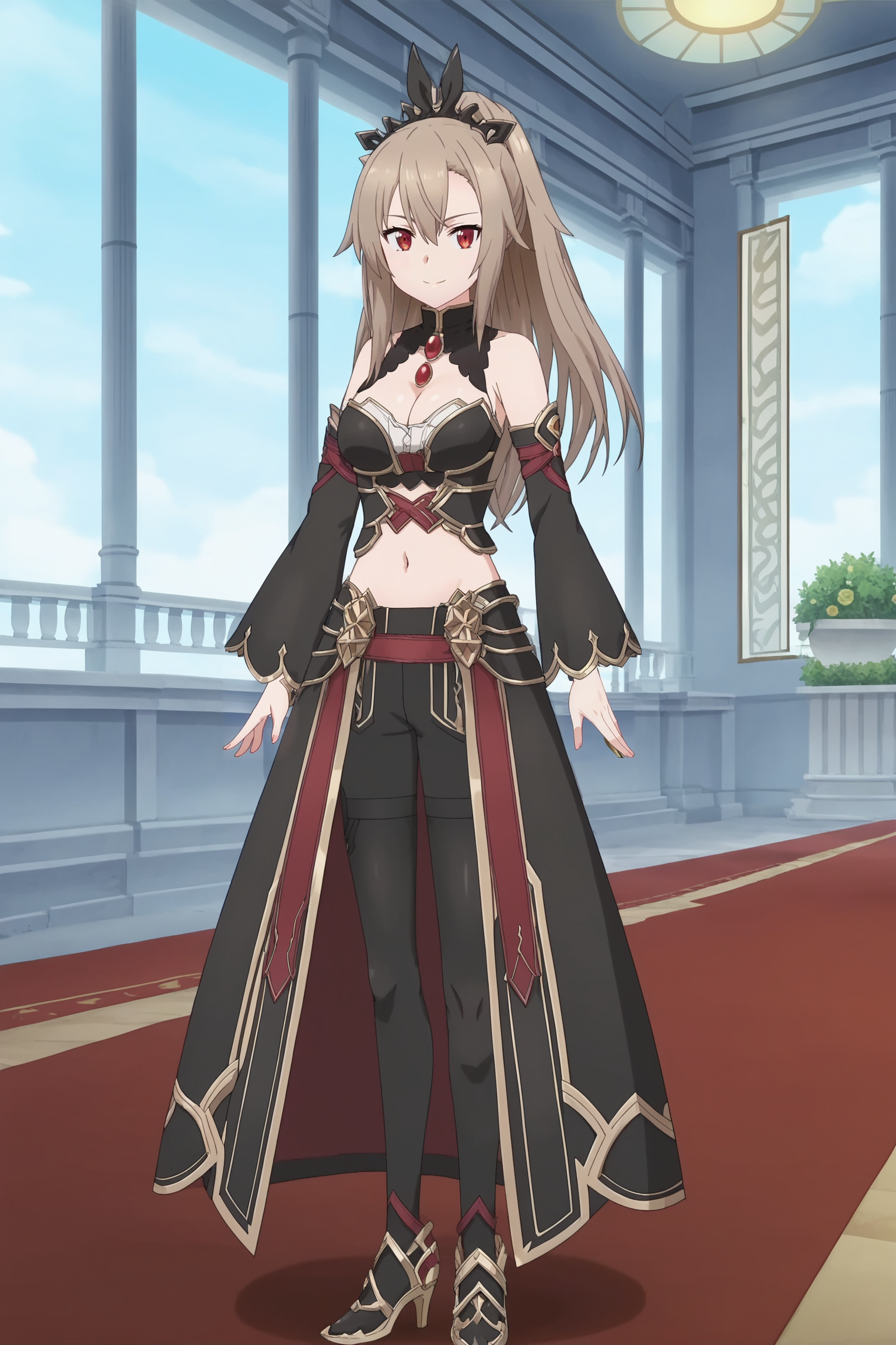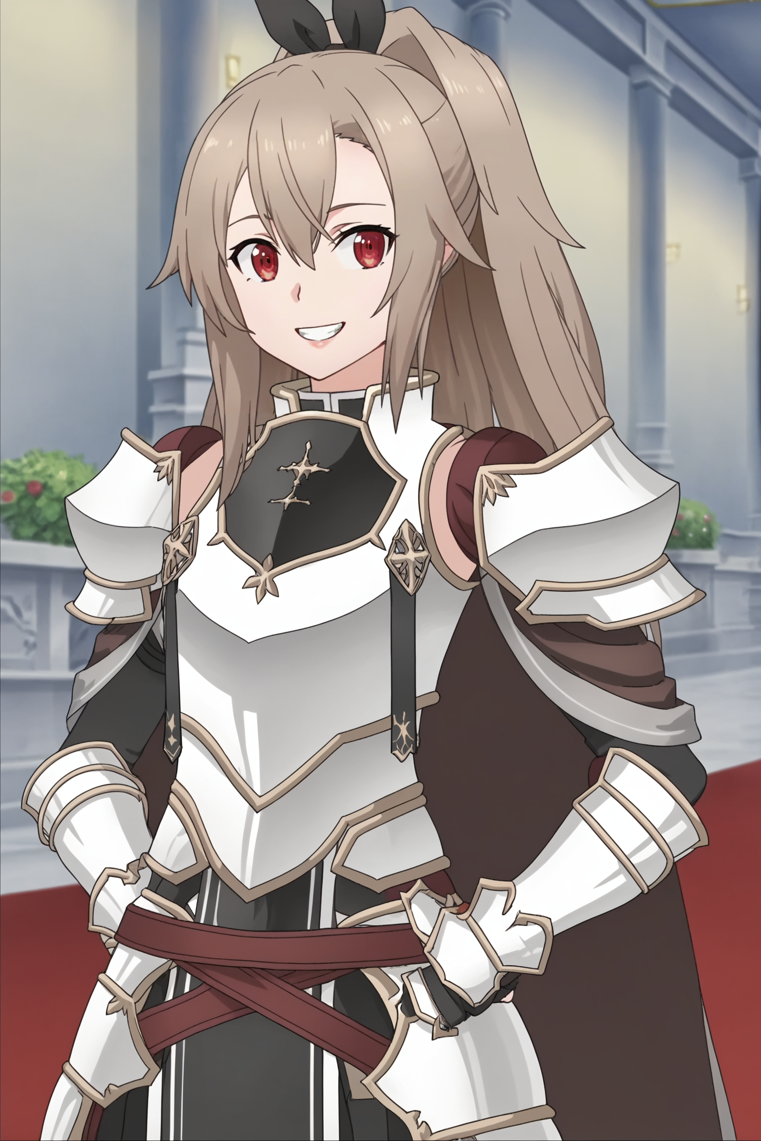 Essential keywords you’ll probably want to use each time: long hair, brown hair, red eyes, ponytail
