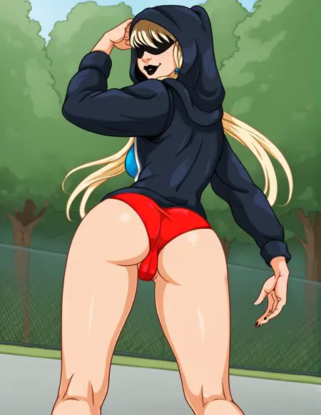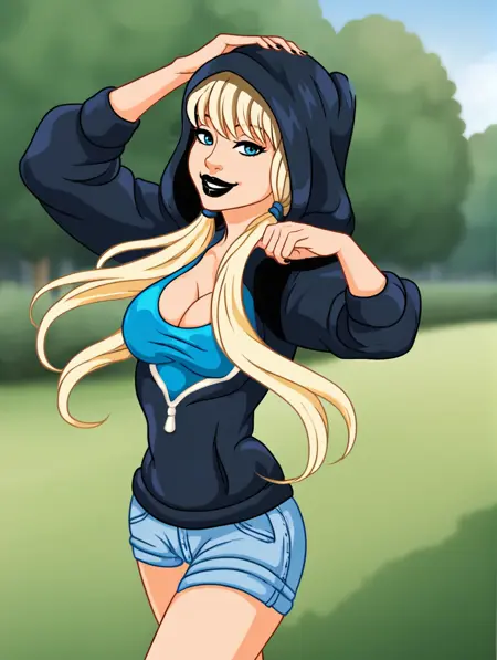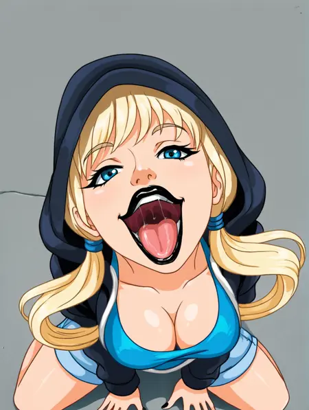 ResistanceGirl, low twintails, blonde hair, black lips, lipstick, eyepatch, hoodie, hood, blue tanktop, cleavage, blue eyes (only when not using eyepatch)